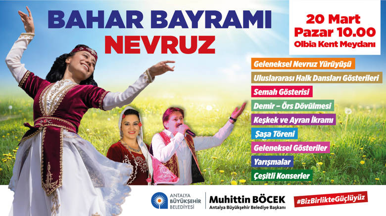 Ulusal ve uluslararası dayanışma ve yörük dernekleri işbirliği içinde gerçekleşecek kutlama programı 20 Mart Pazar günü saat 10.00’da Konyaaltı Sahil Antalya Yaşam Parkı Erdem Otel karşısından Olbia Kent Meydanı’na Geleneksel Nevruz Bayramı Yürüyüşü ile başlayacak. Kutlama programı kapsamında Ahıska Türkleri, Azerbaycan, Kazakistan, Kırgızistan, İran ve Irak Türkleri halk dansları gösterileri, semah gösterisi, demir-örs dövülmesi, ateşten atlama, keşkek ve ayran ikramı, geleneksel yarışmalar ve konserler düzenlenecek. Nevruz bayramı kutlamalarına tüm Antalyalılar davetli.