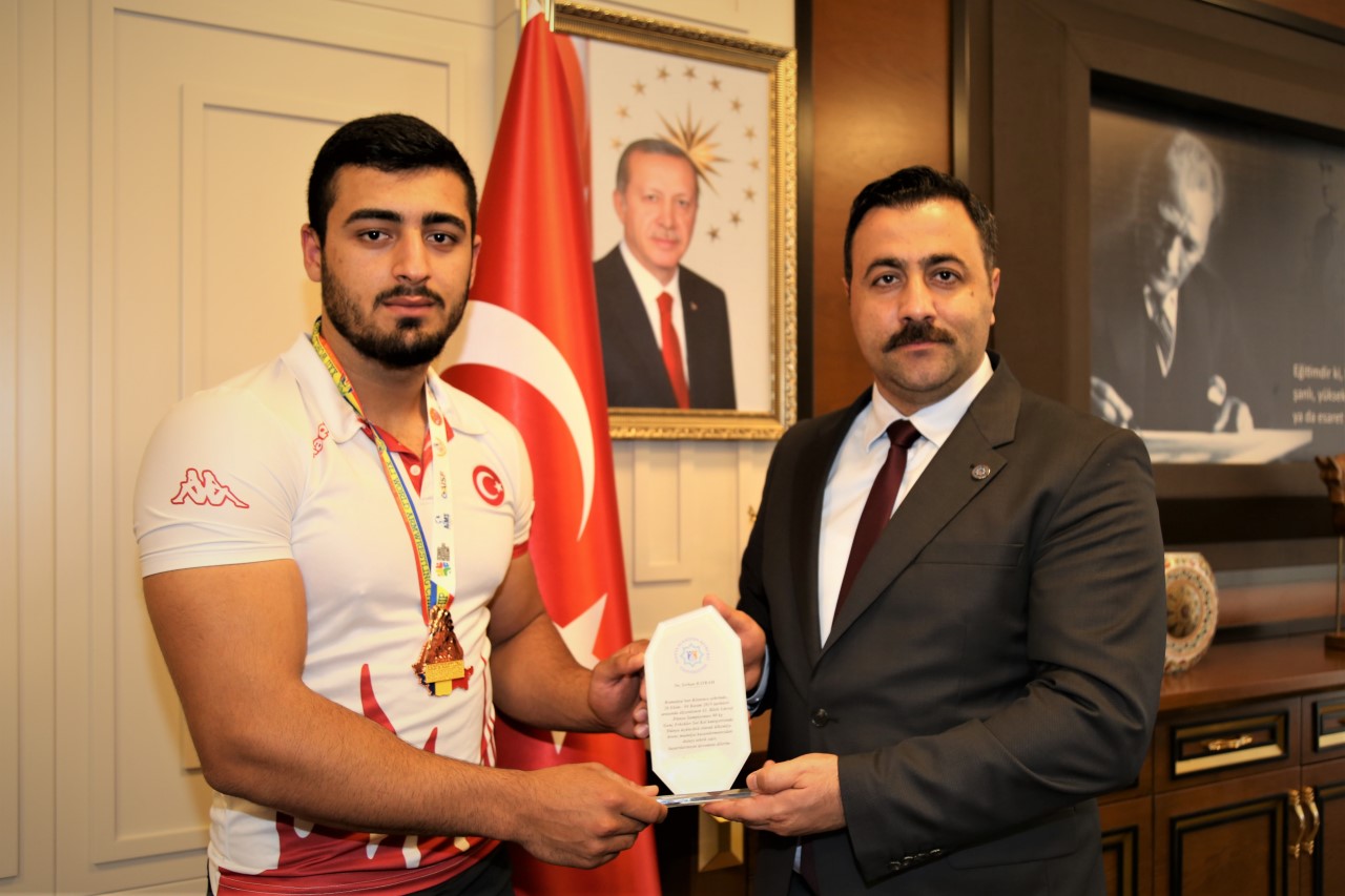 Makamında, Milli Sporcuyu kabul eden Rektör Kalan, bu tür başarıların Türkiye’yi gururlandırdığını dile getirerek, “Böylesi güzel başarıların üniversitemiz öğrencileri arasından çıkması bizi ayrıca gururlandırıyor. Ben başta sevgili öğrencimiz Serkan Bayram olmak üzere kendisinin bu başarısında emeği geçmiş tüm hocalarına teşekkür eder, üzerimize düşen her türlü desteği vermeye hazır olduğumuzu belirtmek isterim” dedi.